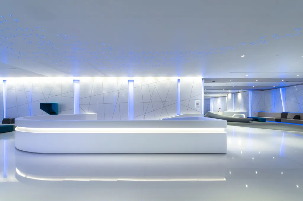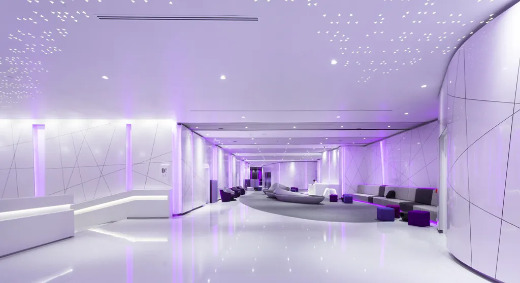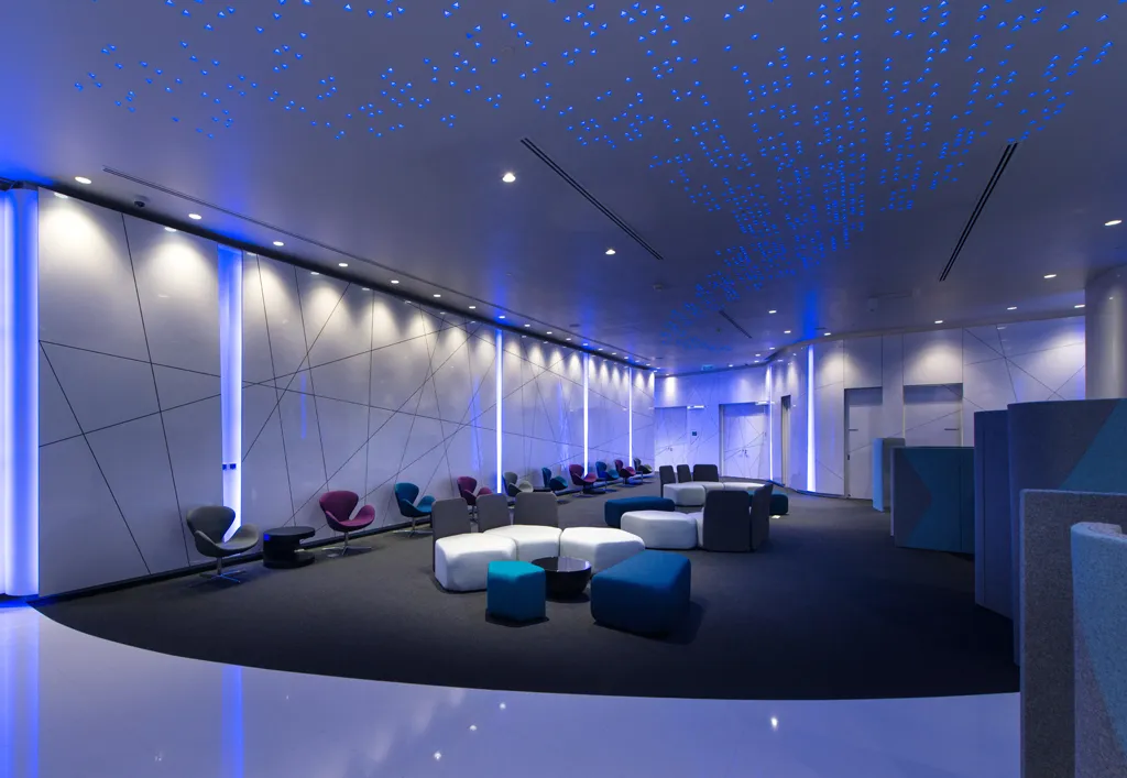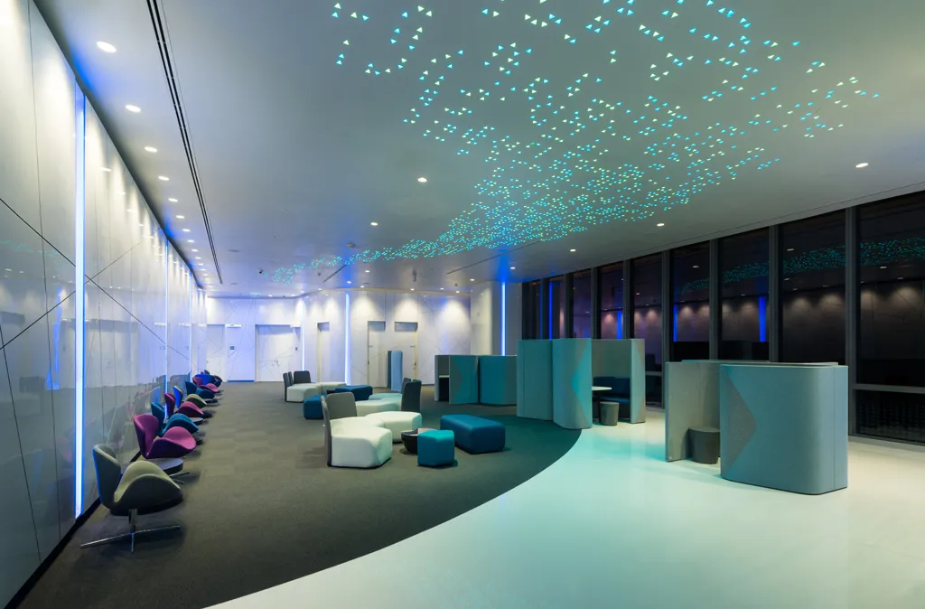 At Pre-function and break out areas, colour changing LEDs were selected to support training subjects and themes. For Main Stair, almost 3,000 Custom made RGB LEDs Triangle shape downlights are individually control by DMX system. They perform as a stars, an information that being analyze.
