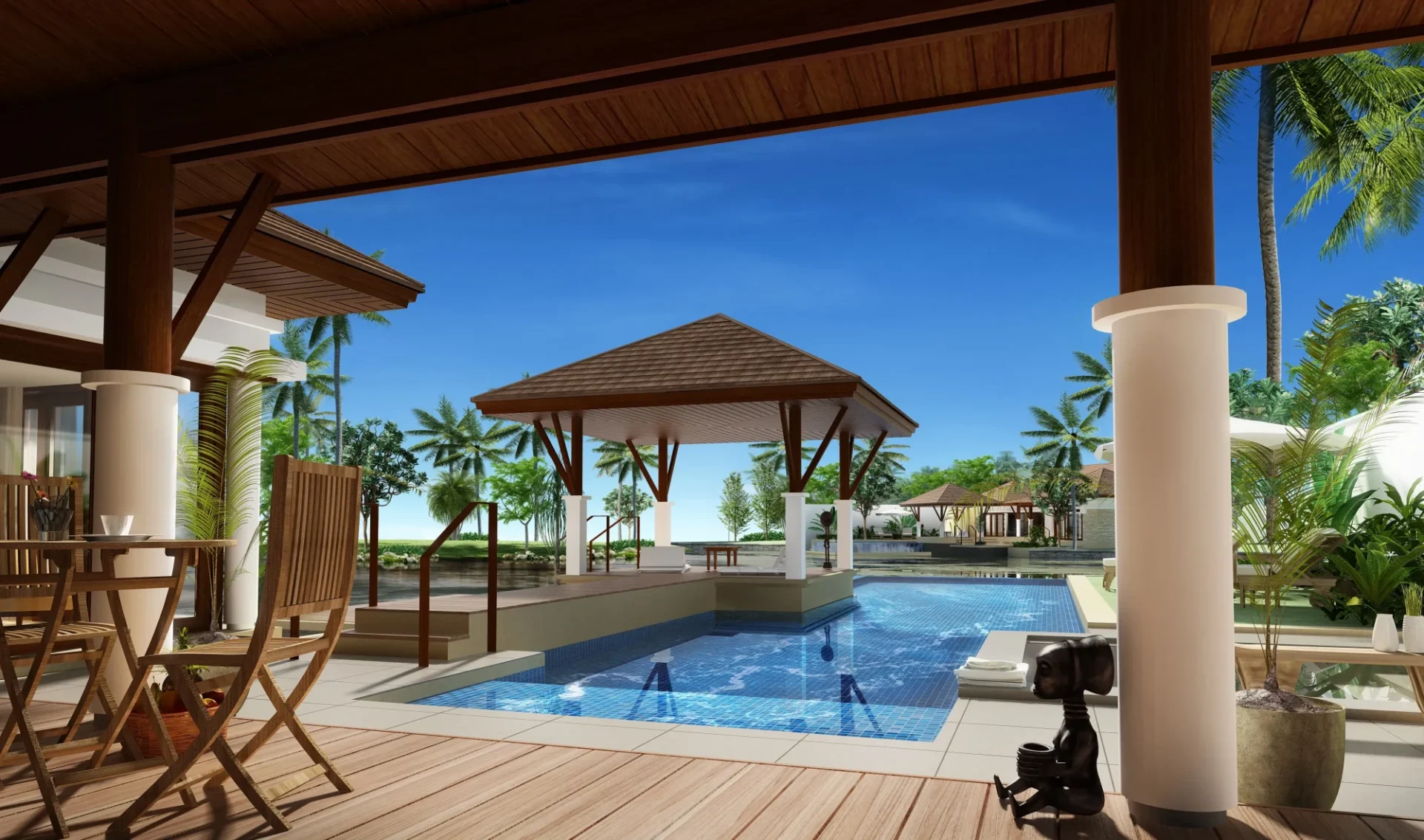 A special spa area provides day spa facilities and also longer stay guestrooms. Most of the hotel guestrooms are in individual villas or small low rise villa blocks set around extensive lagoons connected to natural canal.